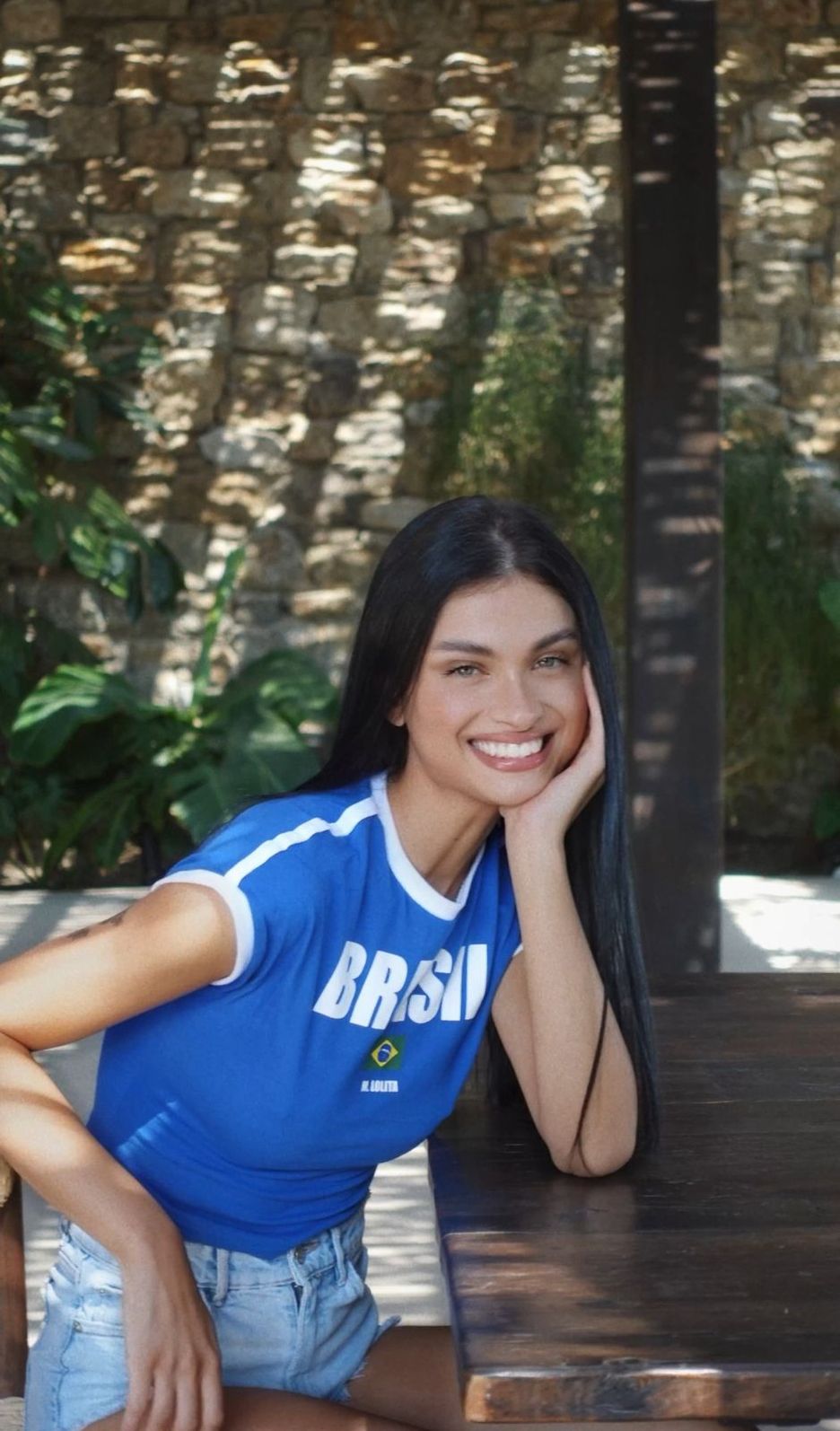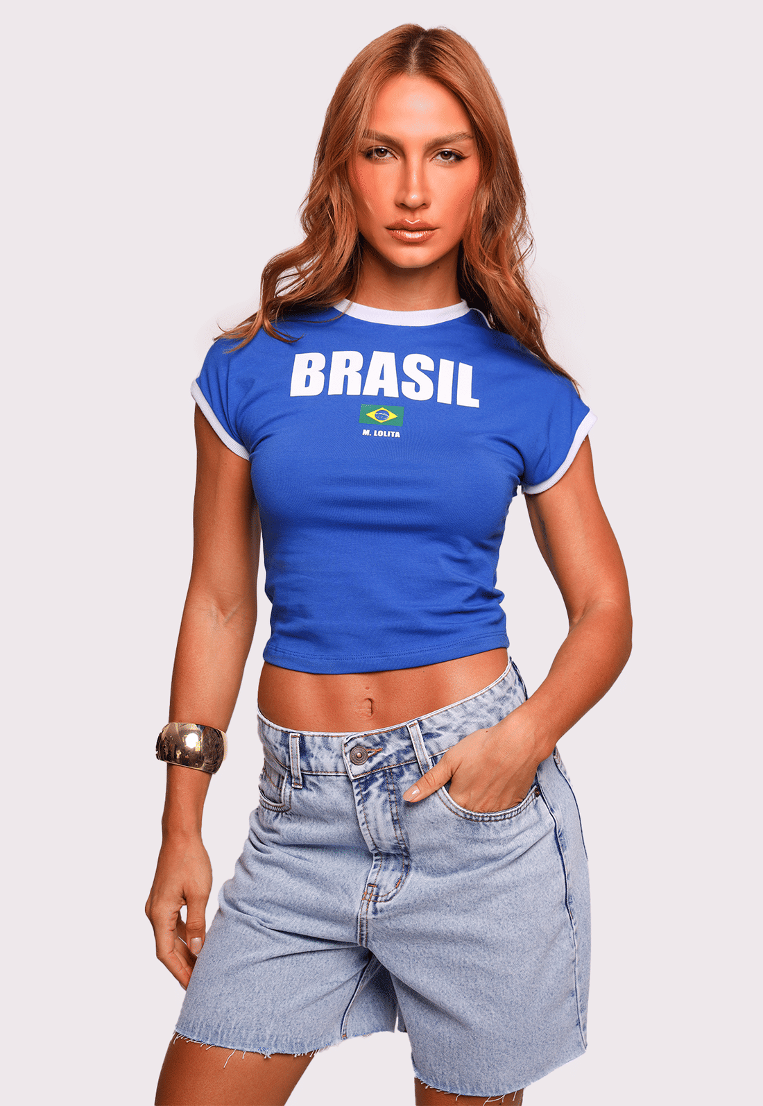 Adicionarnossa baby tee azul vem com shape justinho que valoriza a silhueta e detalhes em frisos contrastantes na gola, ombros e mangas, criando um ar esportivo e moderno. a estampa “Brasil” dá o toque final, perfeita pra quem ama unir estilo e orgulho nacional.