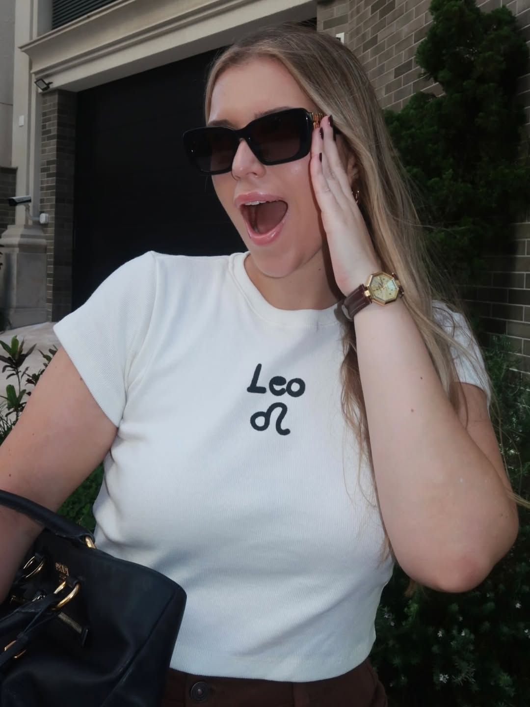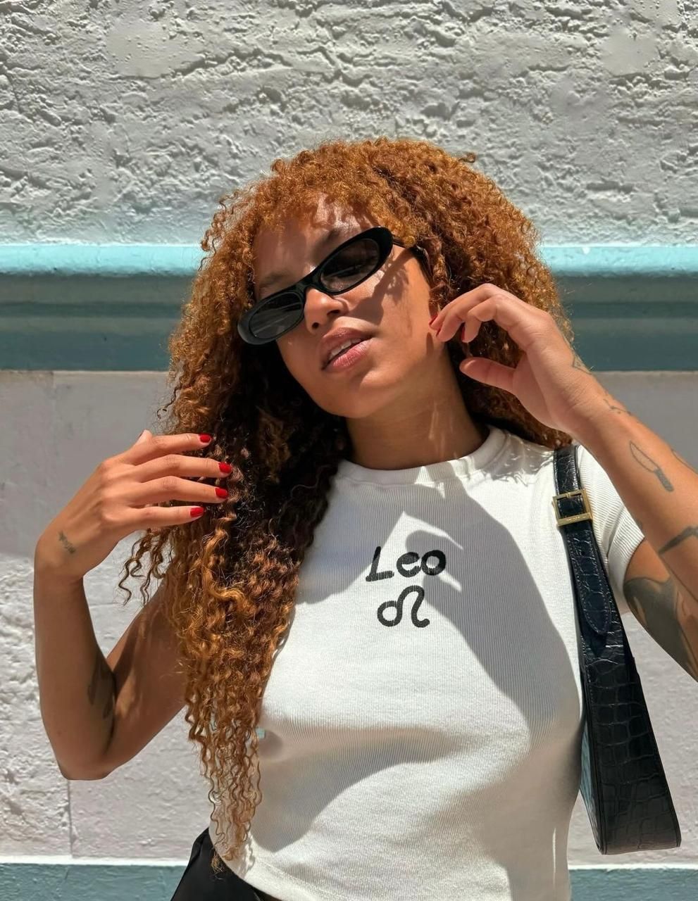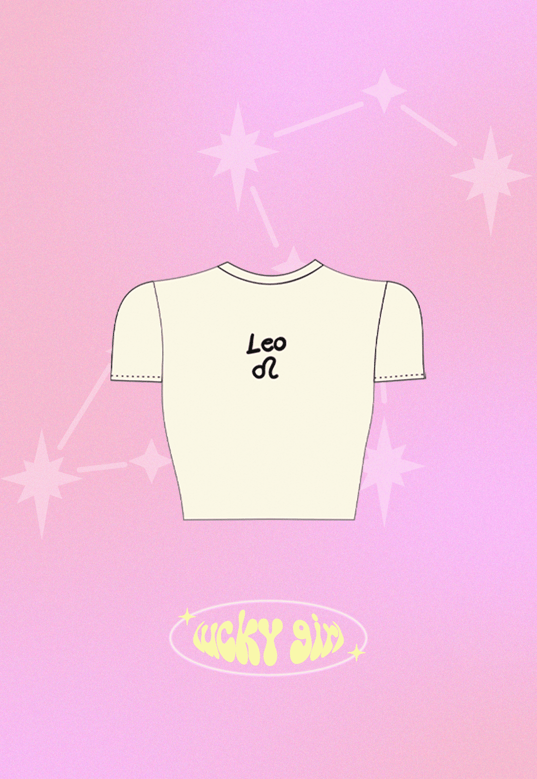 Detalhe: baby tee com shape ajustado ao corpo e estampa de signo com efeito de pintura manual
