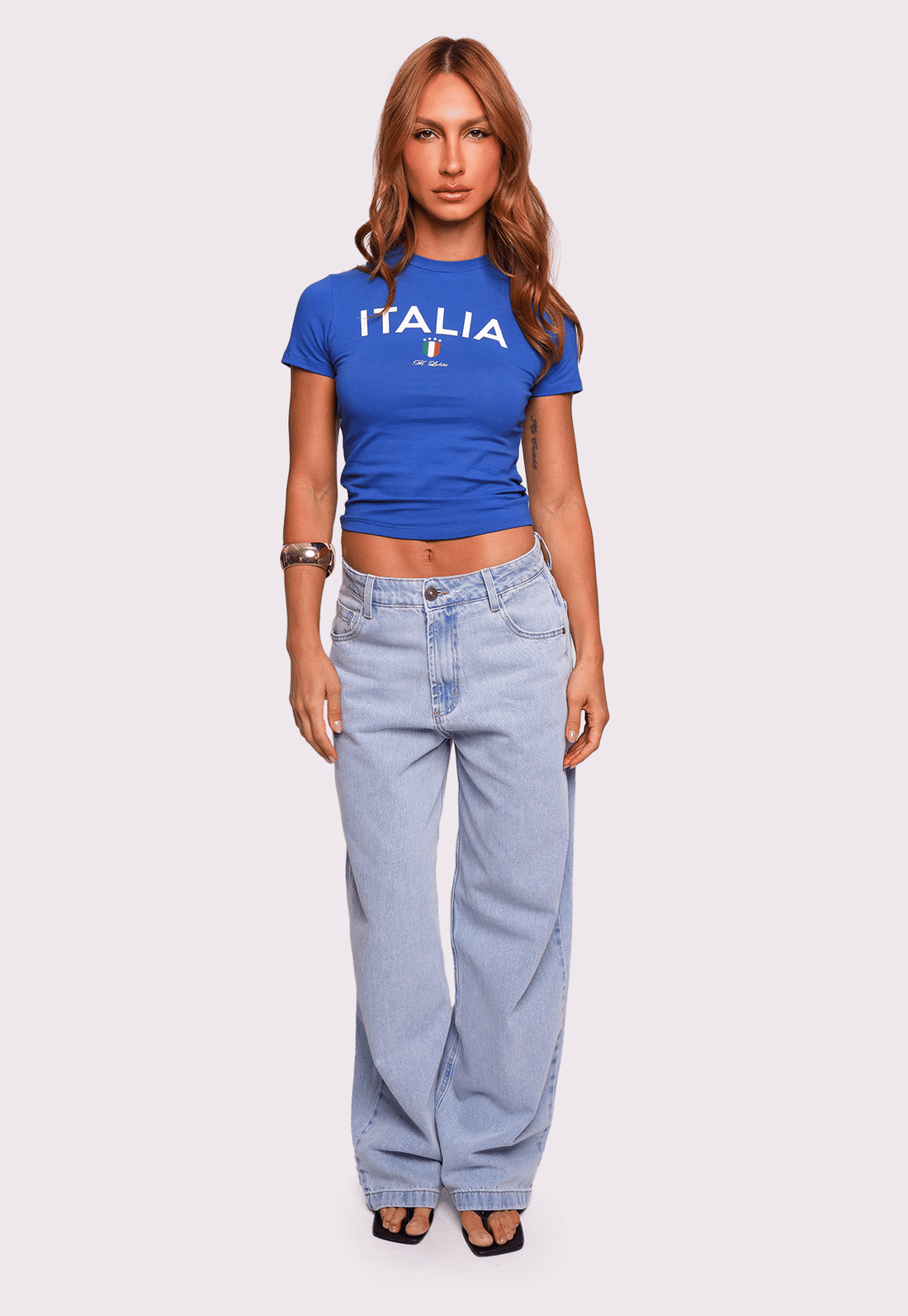 detalhe: baby tee cropped azul com estampa localizada "ITALIA".