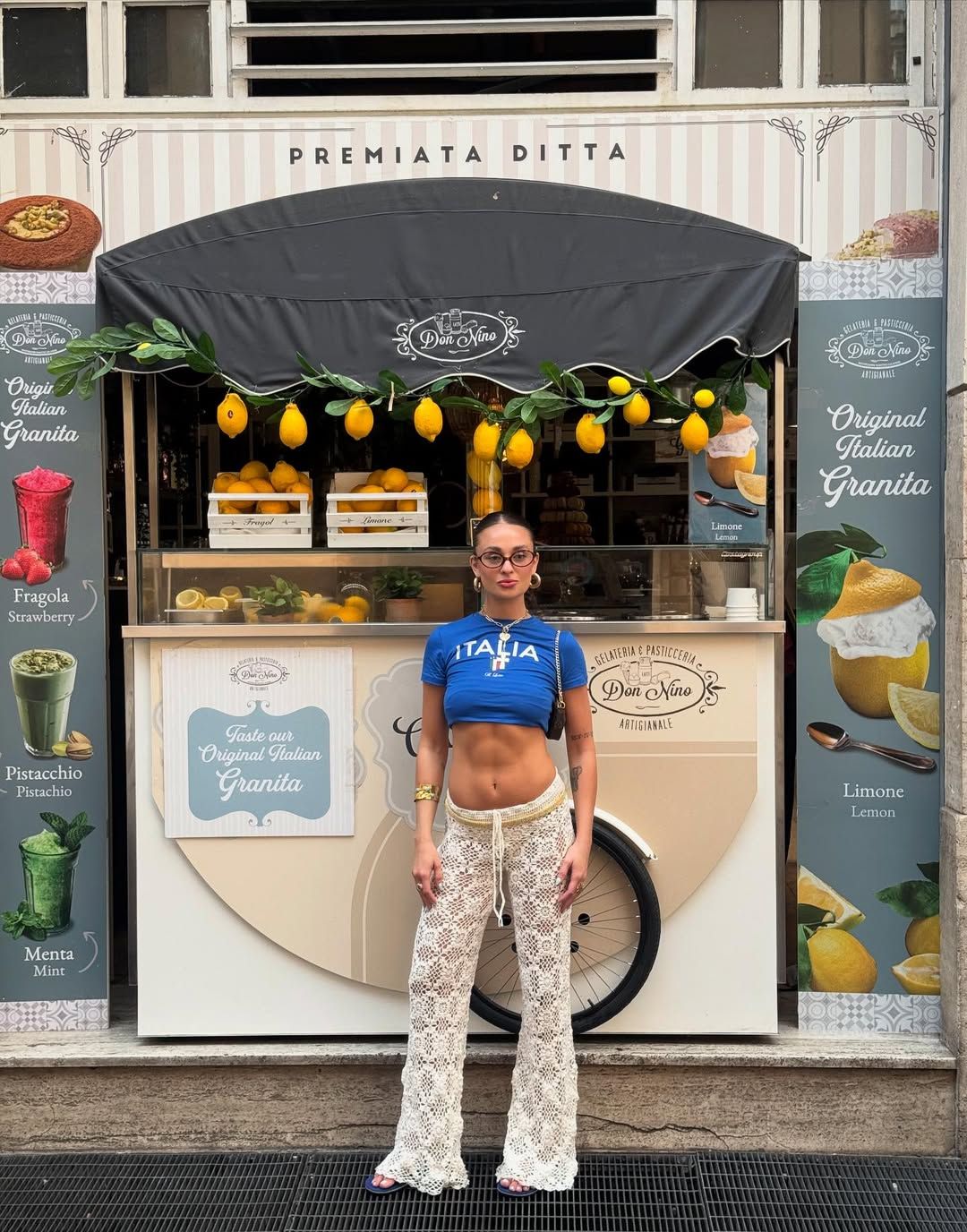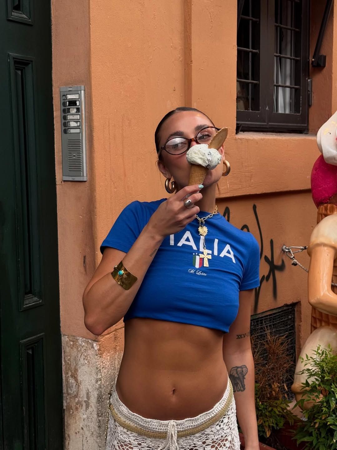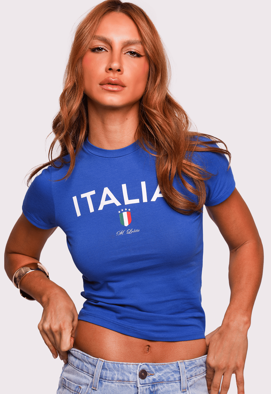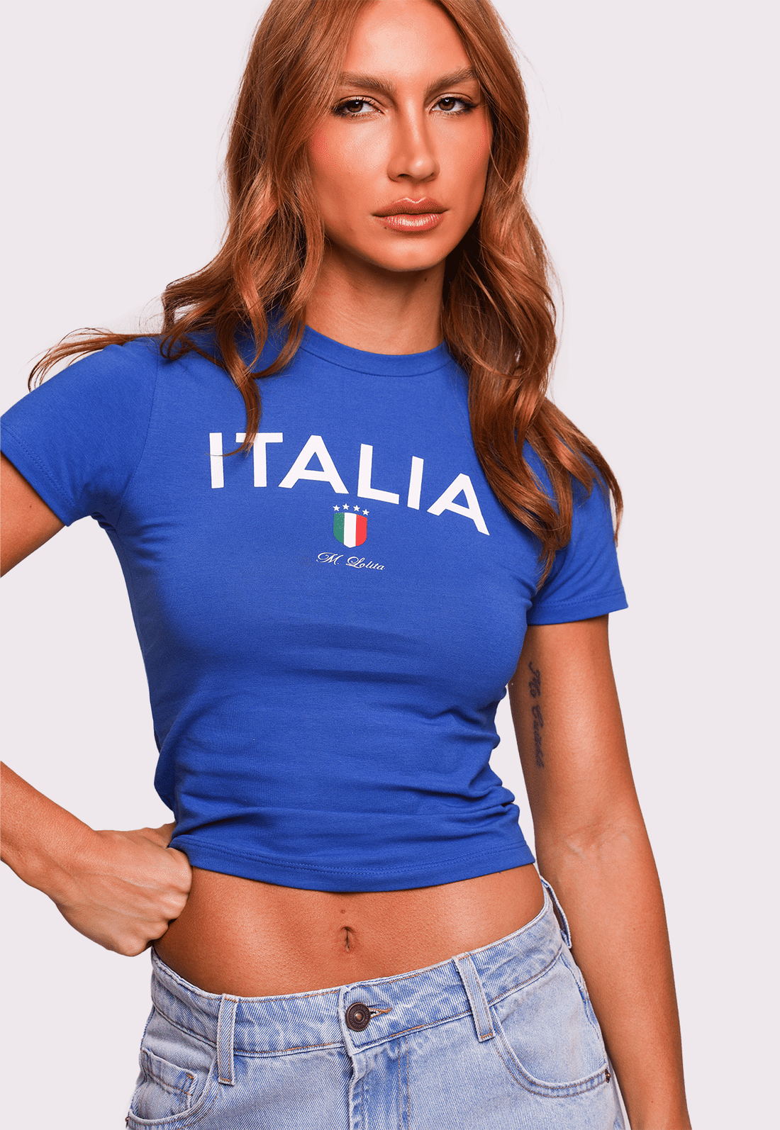 a baby tee italia é puro euro mood. feita em malha conforto azul bic, ela tem modelagem justa e cropped na medida certa. a estampa localizada “italia” com brasão e assinatura m. lolita traz o toque esportivo que deixa qualquer look mais fresh e fashionista. combina com jeans larguinho, minissaia, ou até alfaiataria pra quem ama contrastes.