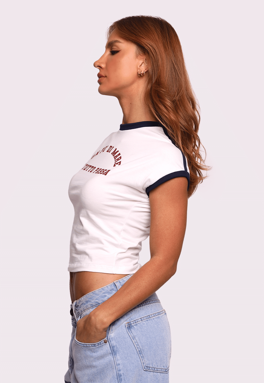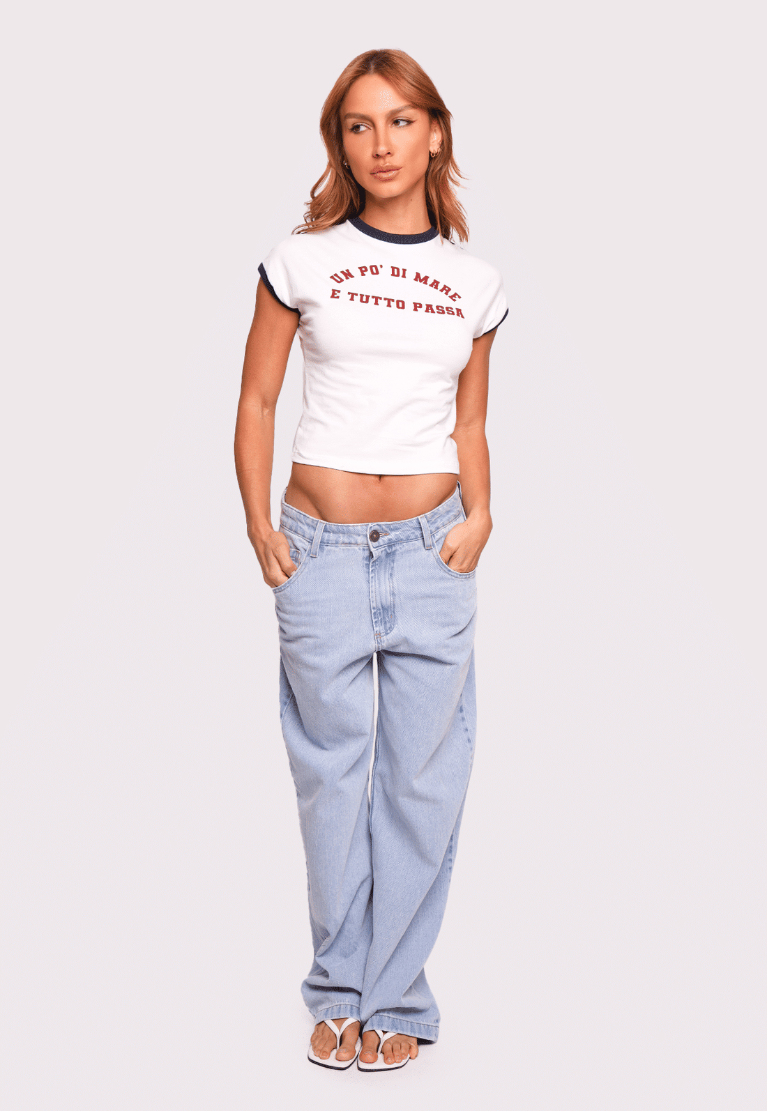 Pequenos detalhes, grande impacto: a combinação do shape justo com o toque náutico dos frisos e a frase em italiano faz dessa tee uma peça que transmite frescor e estilo sem esforço. Perfeita para combinar com shorts jeans, saias leves ou até um look mais arrumadinho de verão.