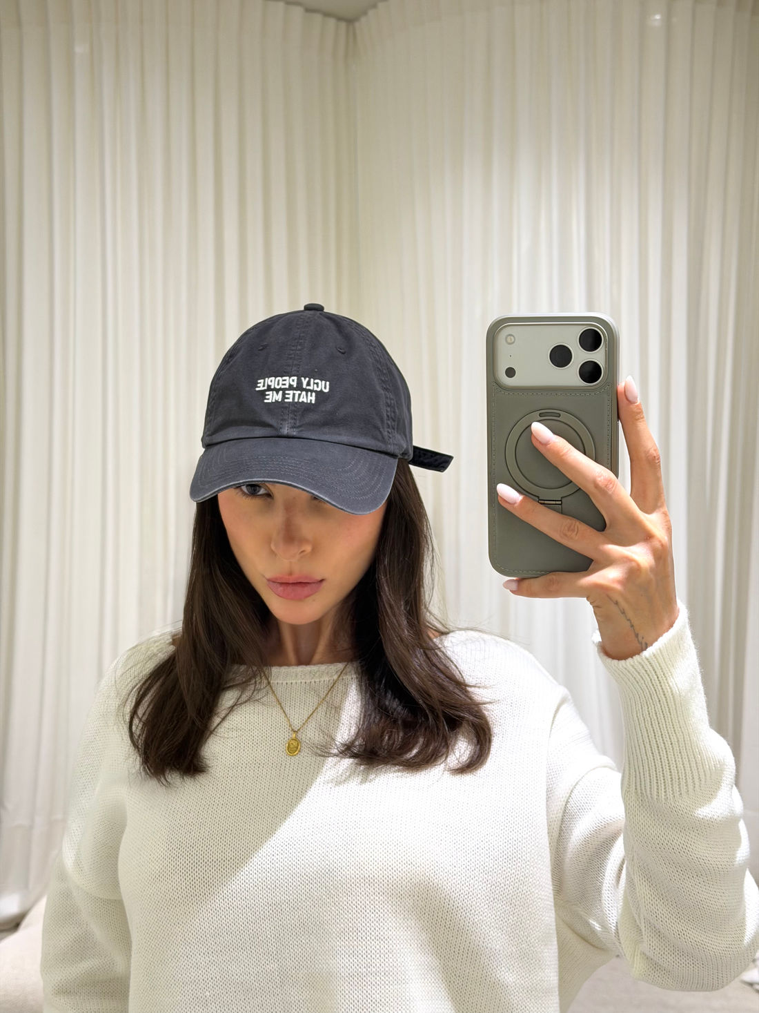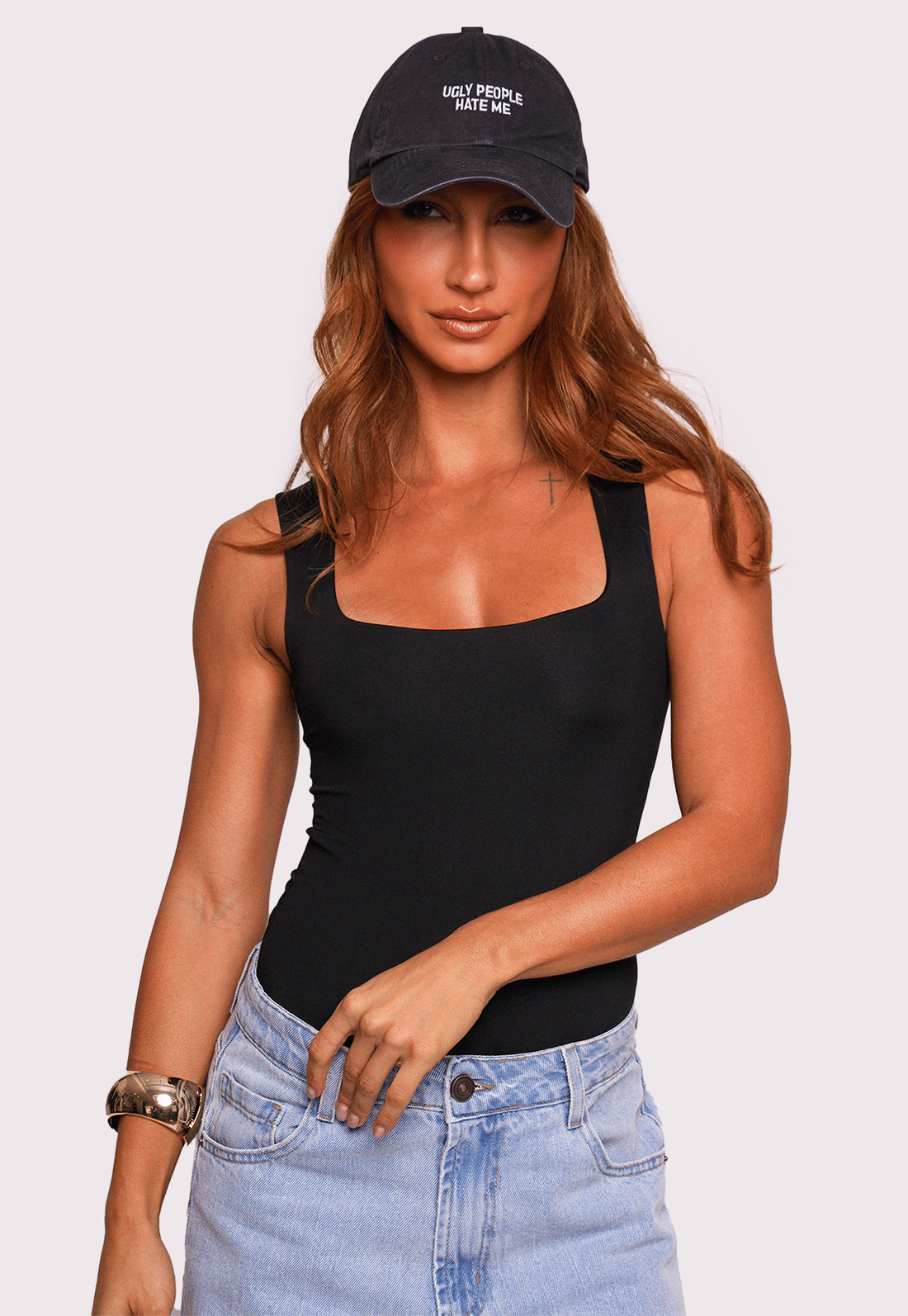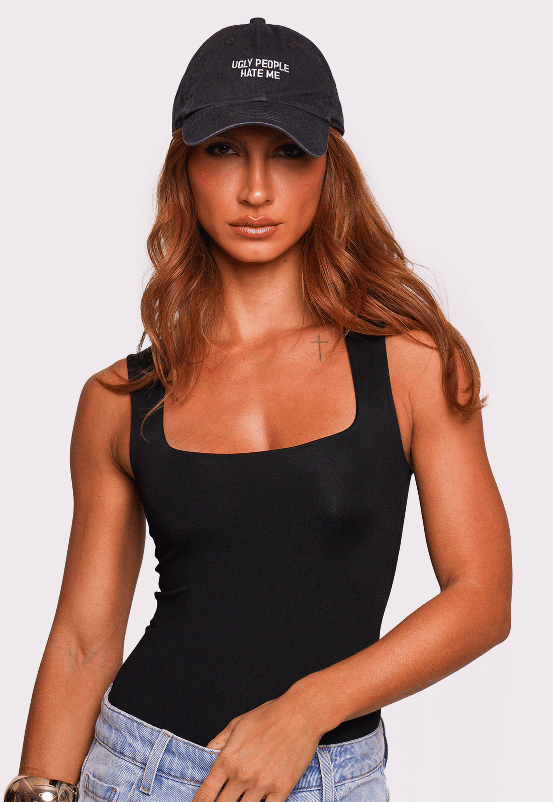 feito em sarja 100% algodão com acabamento estonado, esse boné tem vibe vintage e personalidade de sobra. o modelo tradicional com regulagem de metal personalizada garante conforto e ajuste perfeito. e o destaque, claro, é o bordado frontal "ugly people hate me" — uma frase que mistura humor e atitude, perfeita pra quem não passa despercebida.