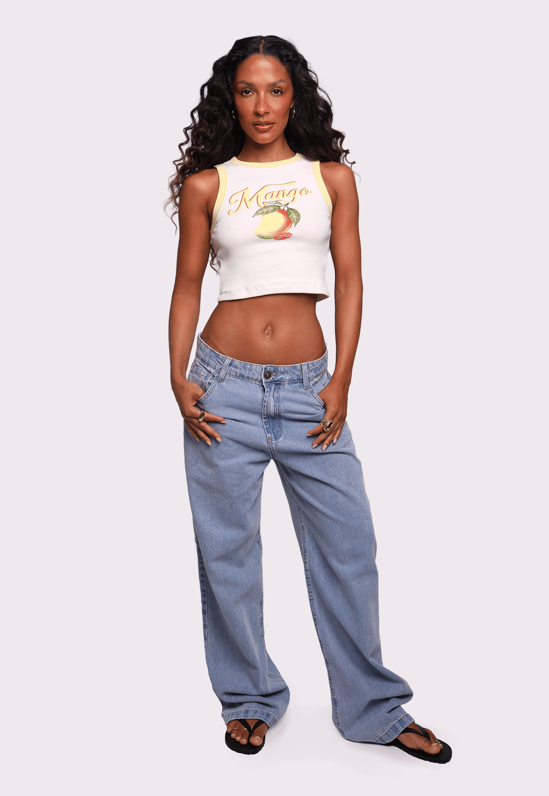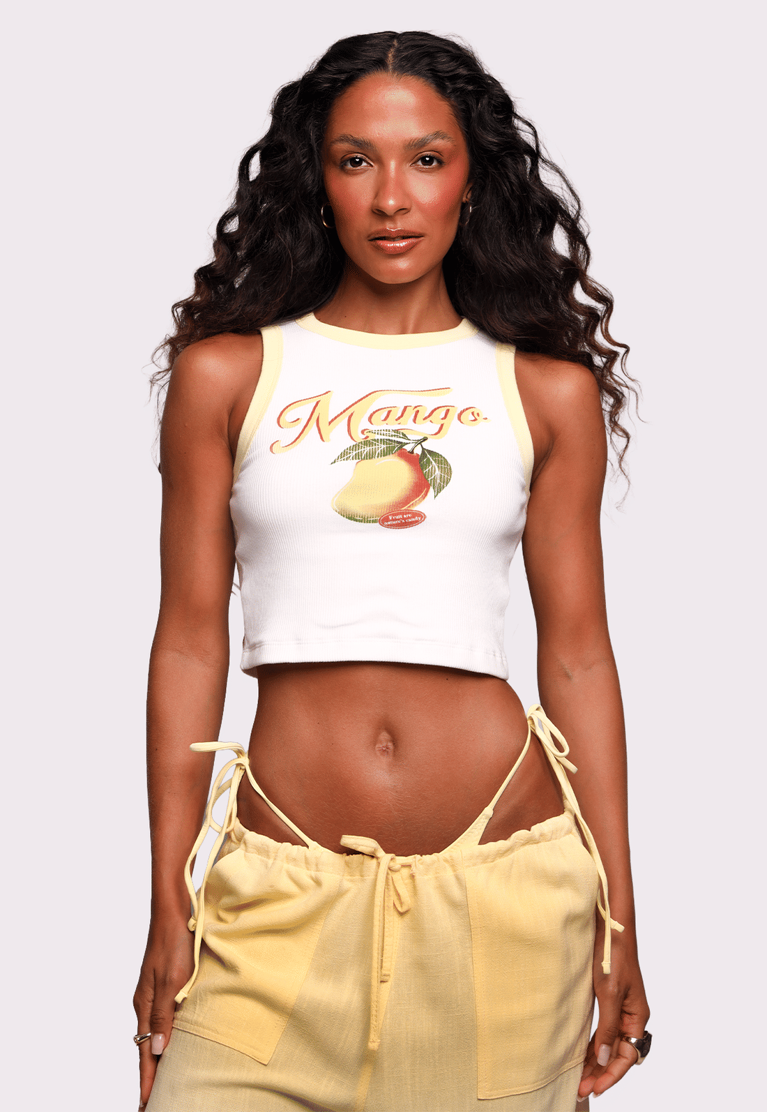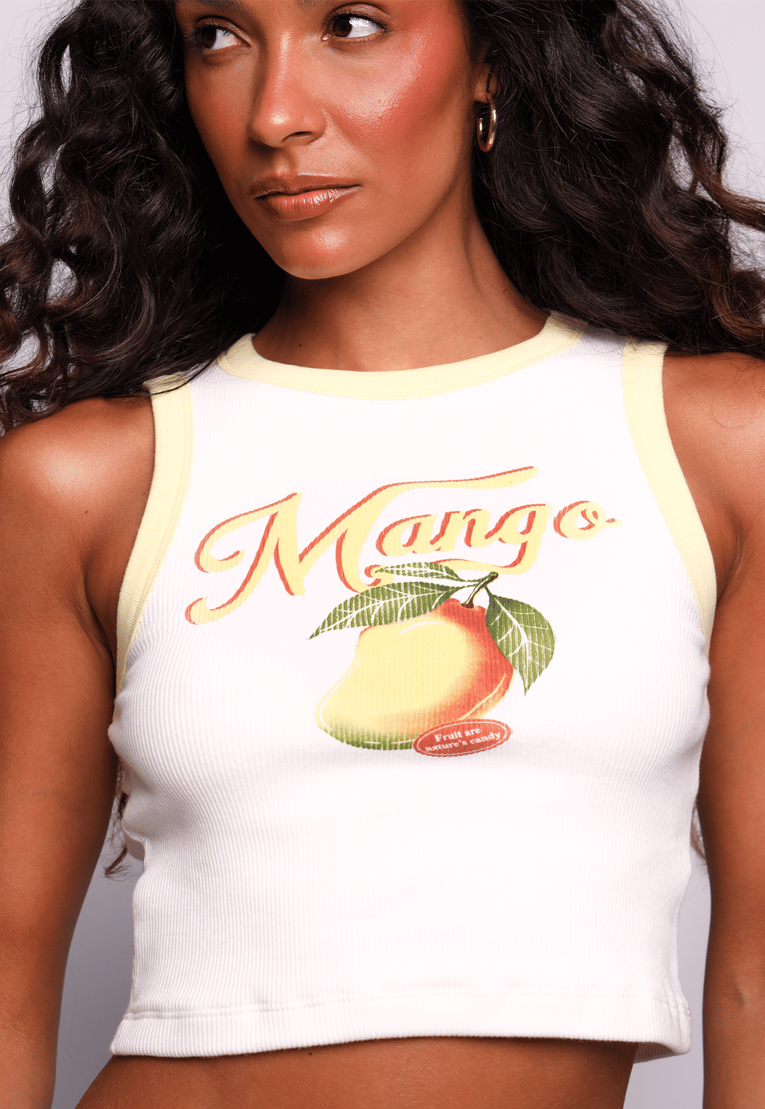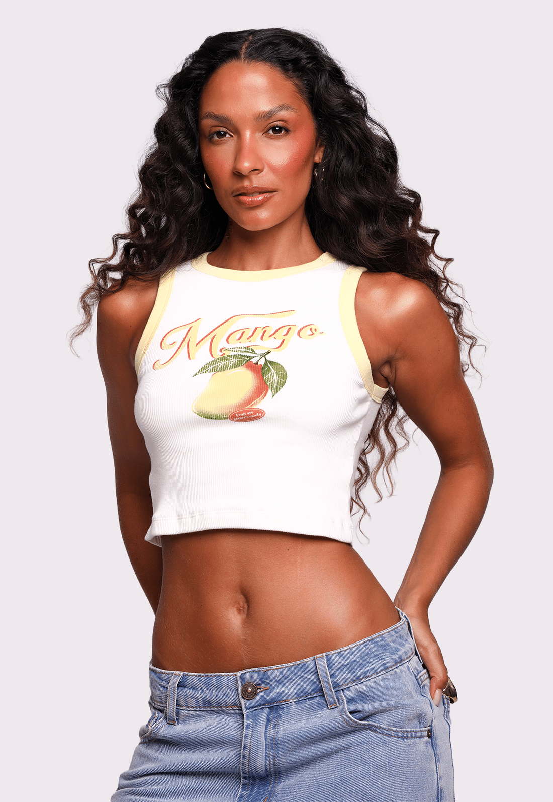 A Regata Mango é confeccionada em ribana de algodão 100%, garantindo conforto, respirabilidade e caimento leve no corpo. Possui decote redondo, modelagem solta e frente dupla, evitando transparência e deixando a peça ainda mais segura para o dia a dia. Os detalhes em amarelo manteiga trazem charme extra, enquanto a estampa frontal de manga adiciona personalidade e um mood tropical irresistível.