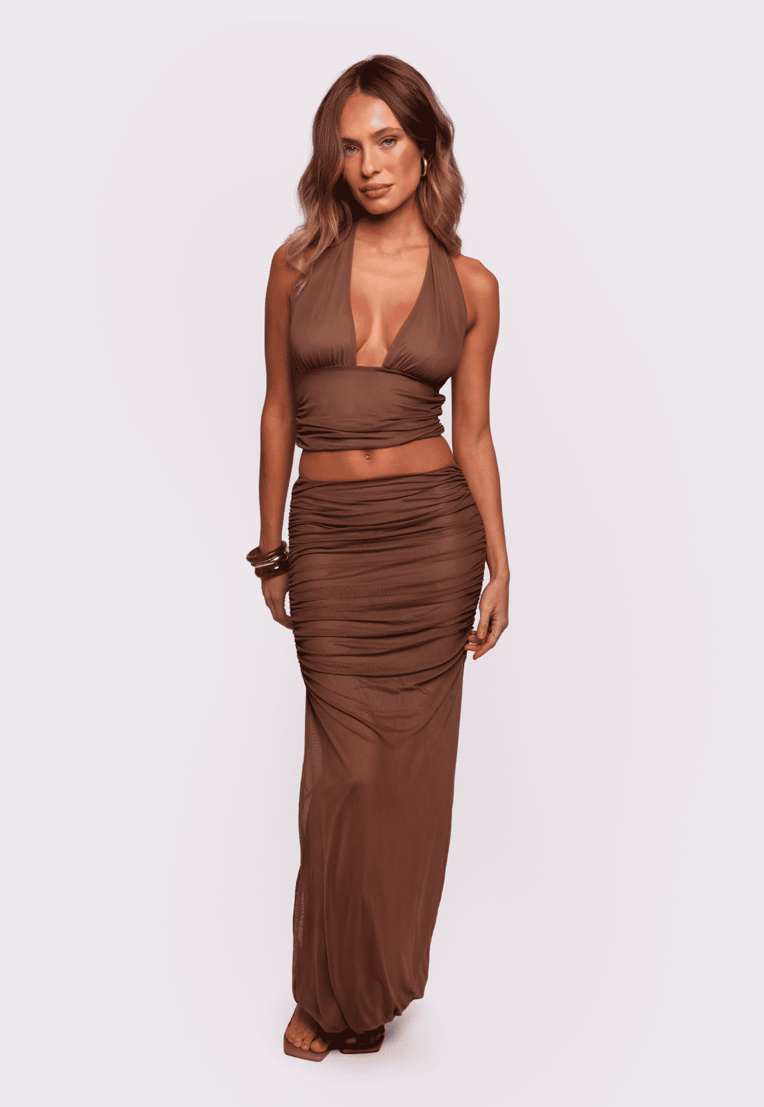 detalhe: Saia de comprimento longo, toda forrada e feita em tule marrom, com drapeados laterais que dão o charme a peça. Vai da praia á festa!