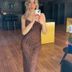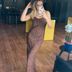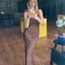 detalhe: Vestido longo de crepe estampado onça, com decote profundo costas possibilitando diversas amarrações.
