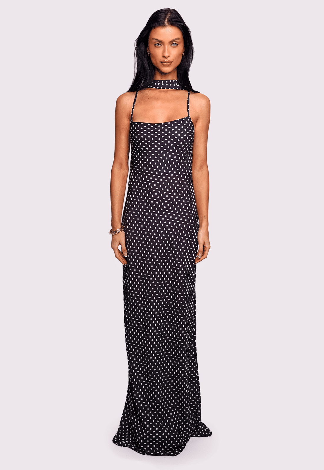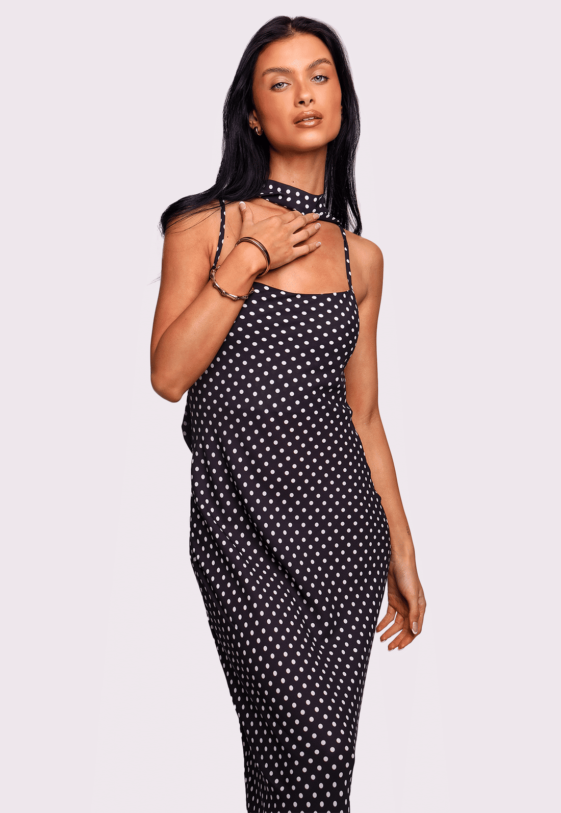 detalhe: Vestido longo de crepe com estampa clássica de poá, perfeito para dias de sol! Com decote profundo costas possibilitando diversas amarrações. Acompanha um lenço (scarf) coordenado, pra usar como quiser: no pesçoco, na cabeça, na cintura..
