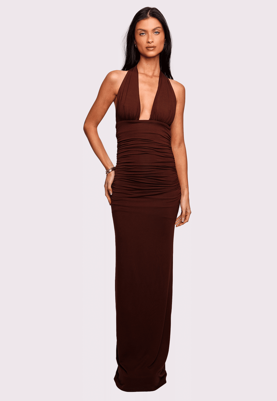 detalhe: Vestido feito em malha marrom, com busto duplo, decote mais profundo e faixa que passa pelo pescoço, que pode ser usada torcidinha. Possui franzido nas laterais do corpo que trazem um charme a mais para a peça. Possui forro para evitar transparência e fenda nas costas para facilitar o movimento.