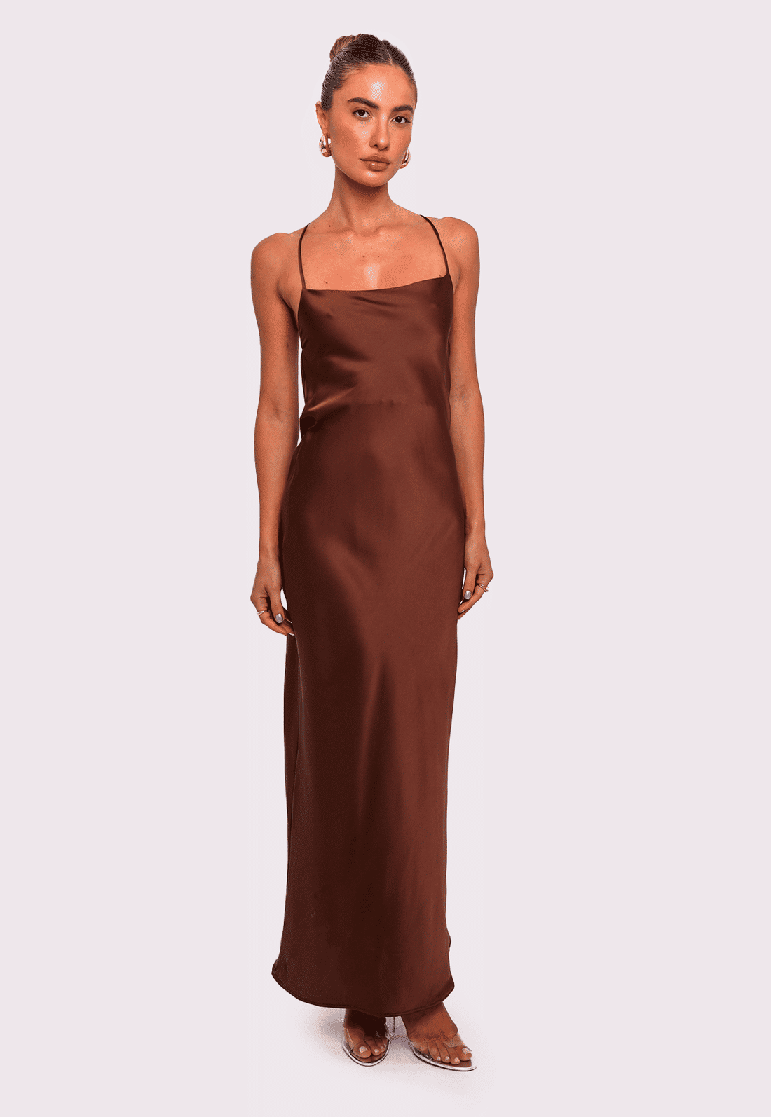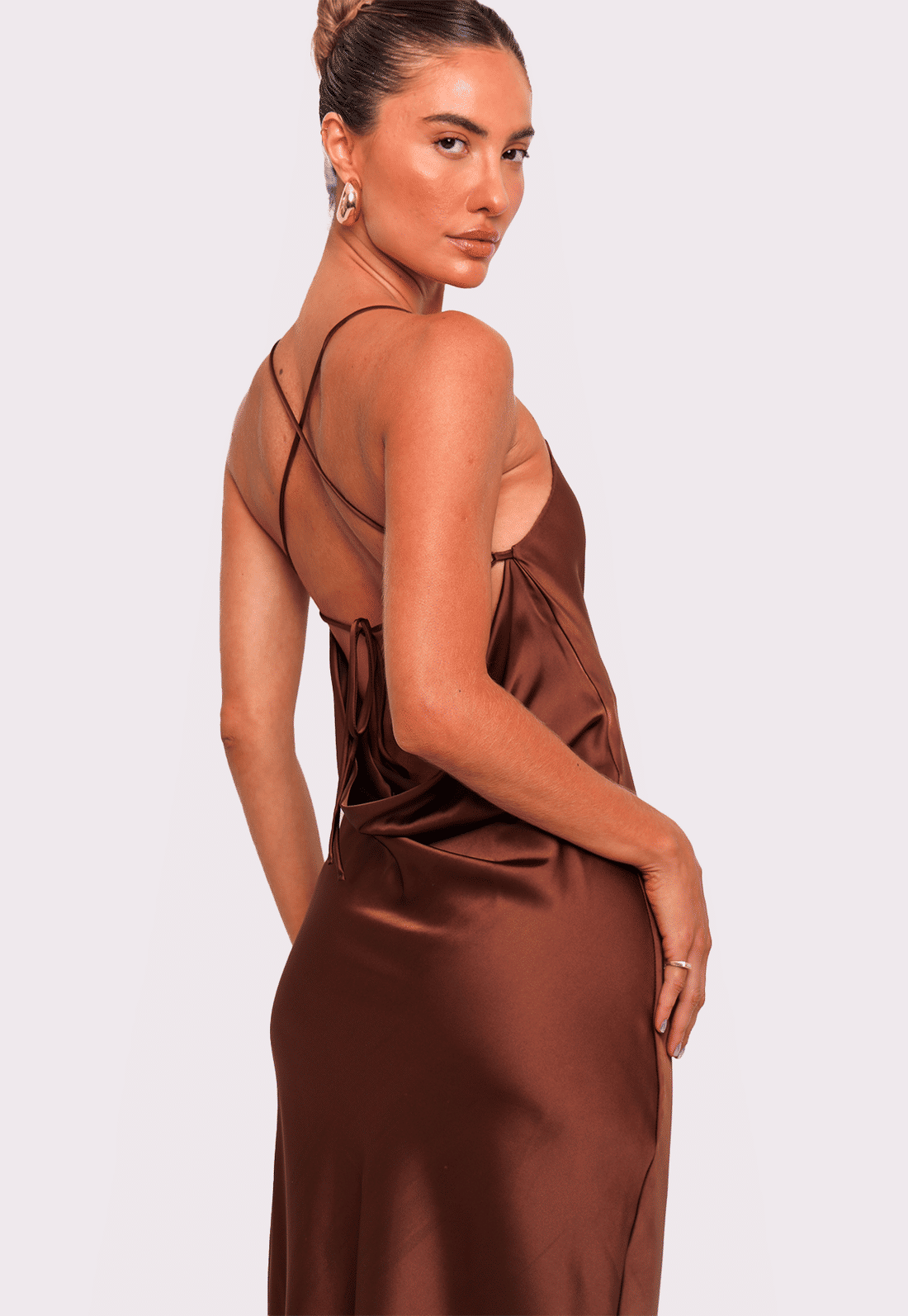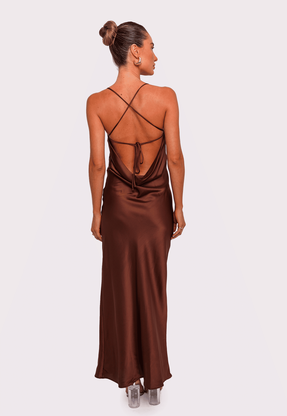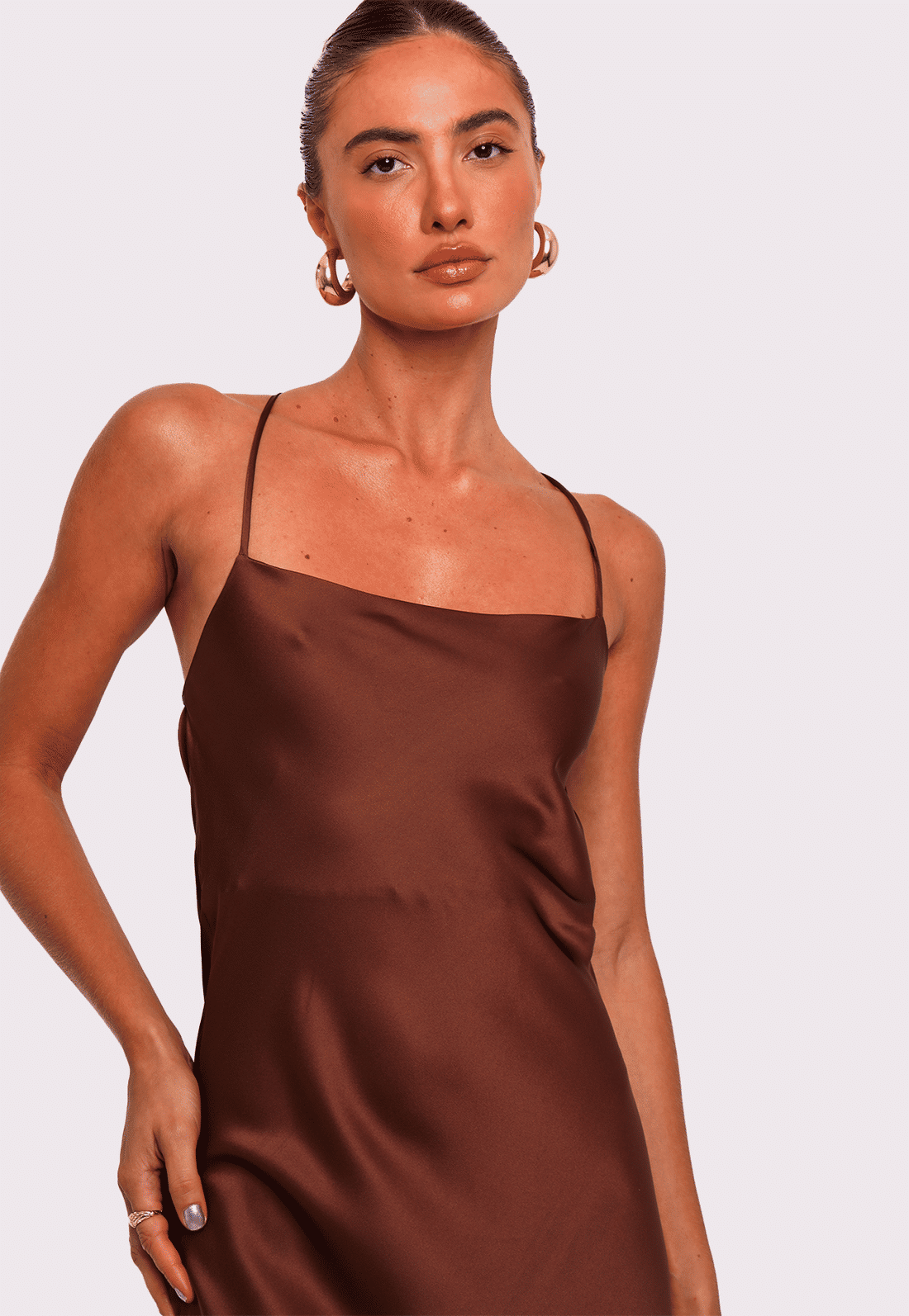 Detalhe: vestido com comprimento longo em cetim, decote degagê nas costas e alças finas que se cruzam e possibilitam regulagem por amarração.