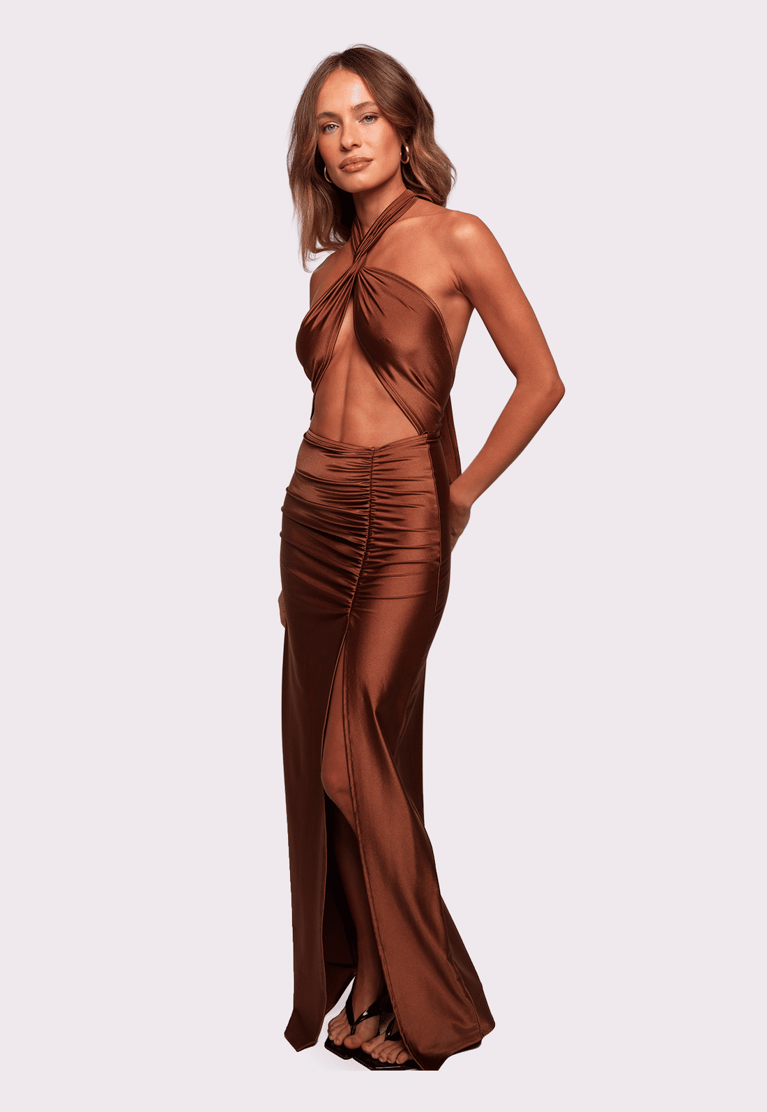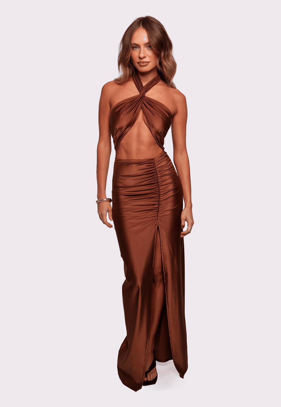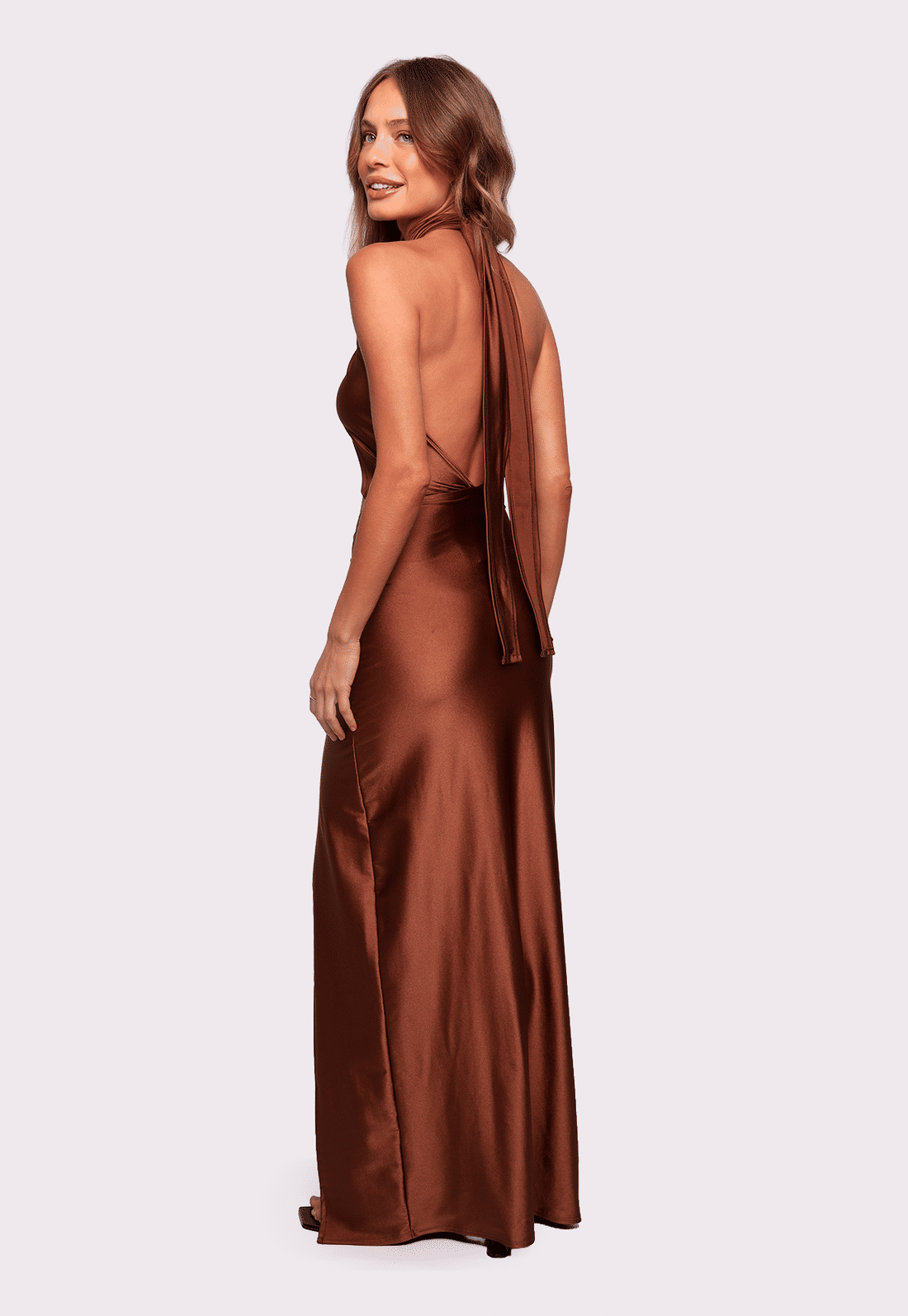 A modelagem é justa, com saia longa e drapeado lateral que alonga a silhueta e traz ainda mais charme ao visual. O grande destaque está no busto multiformas: faixas que saem das costas e permitem diversas formas de amarração, possibilitando criar diferentes looks com a mesma peça — do mais ousado ao mais clássico.