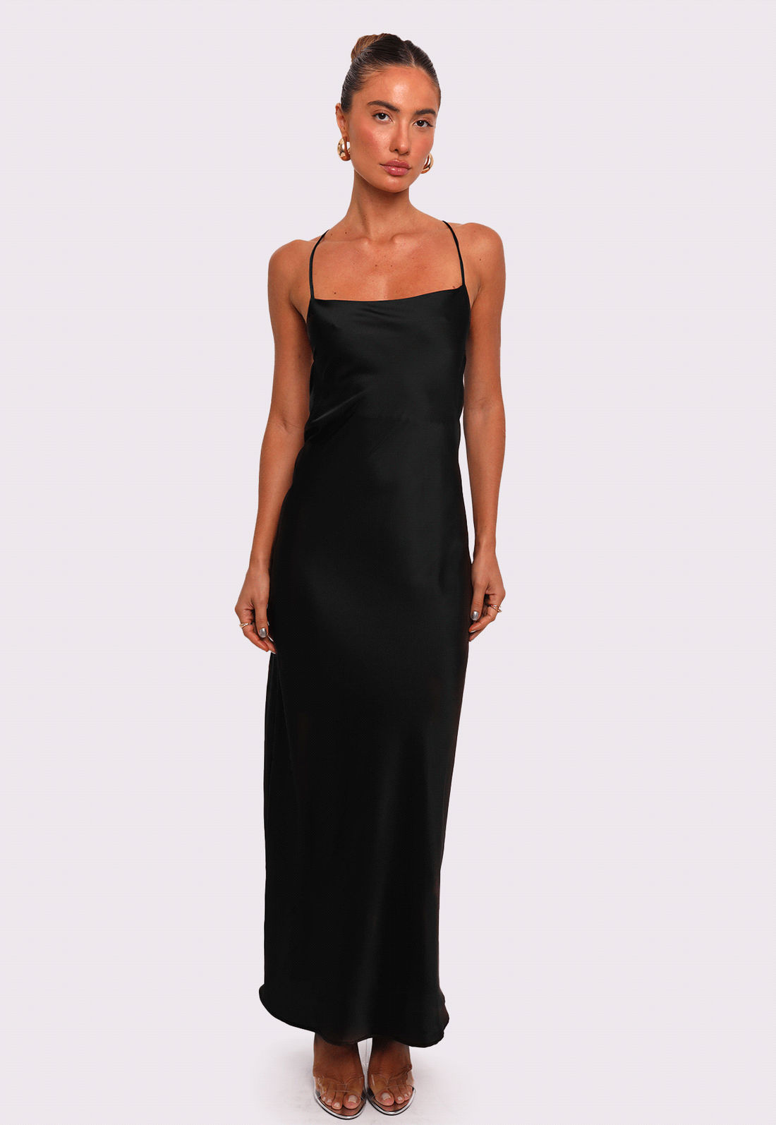 Detalhe: vestido com comprimento longo em cetim, decote degagê nas costas e alças finas que se cruzam e possibilitam regulagem por amarração