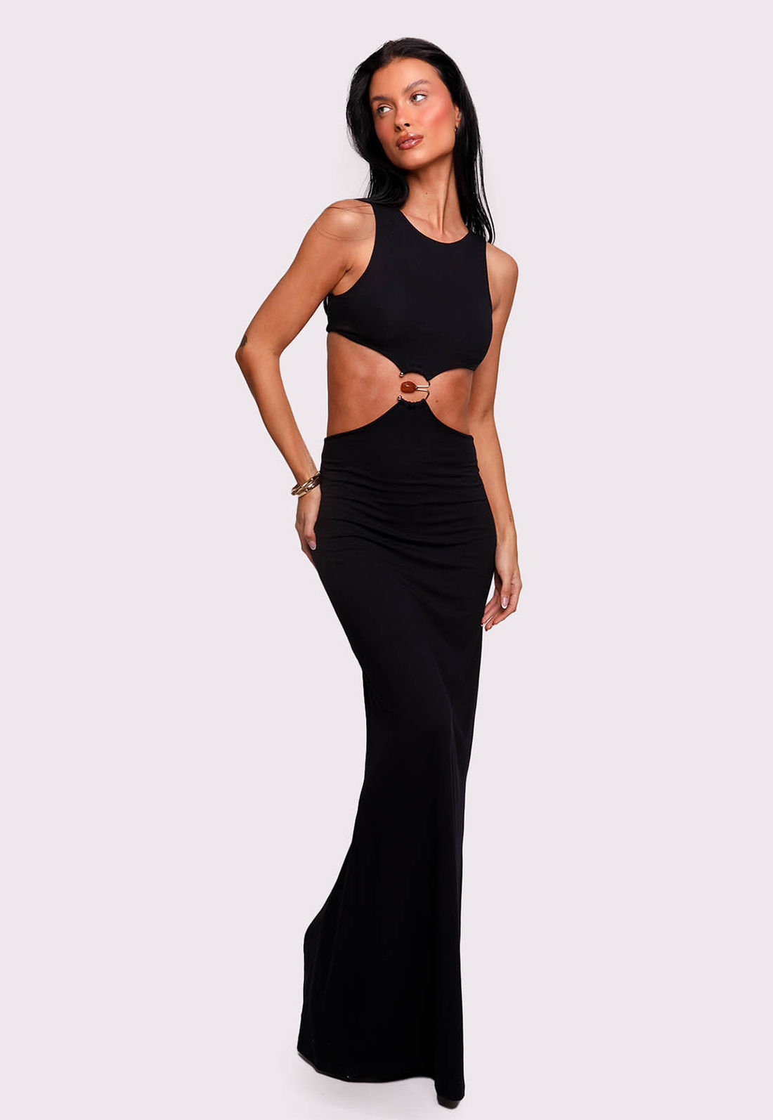 detalhe: Vestido longo feito em viscolycra (que é uma malha feita de viscose com elastano), super macia e maleável. Possui modelagem justa, busto duplo com aviamento dourado com pedra e saia longa forrada.