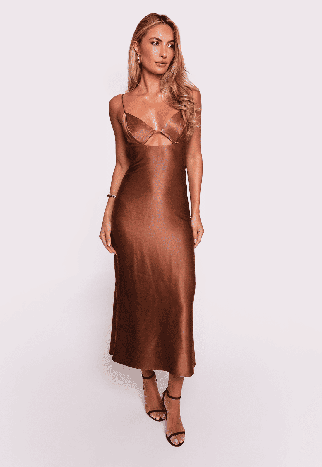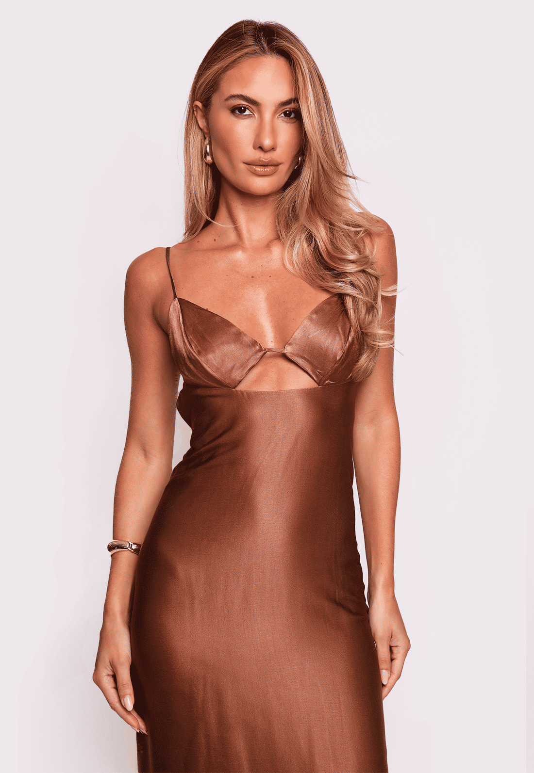 feito em cetim com brilho acetinado e caimento de sonho. o tom marrom sofisticado encontra a sensualidade do recorte frontal e as costas totalmente abertas com amarração fina. o forro leve garante conforto, enquanto o tecido 100% viscose traz fluidez e elegância no movimento. comprimento midi longo, perfeito pra ocasiões onde você quer estar glowing sem esforço. chic, quente e com aquele toque de mistério que a gente ama.
