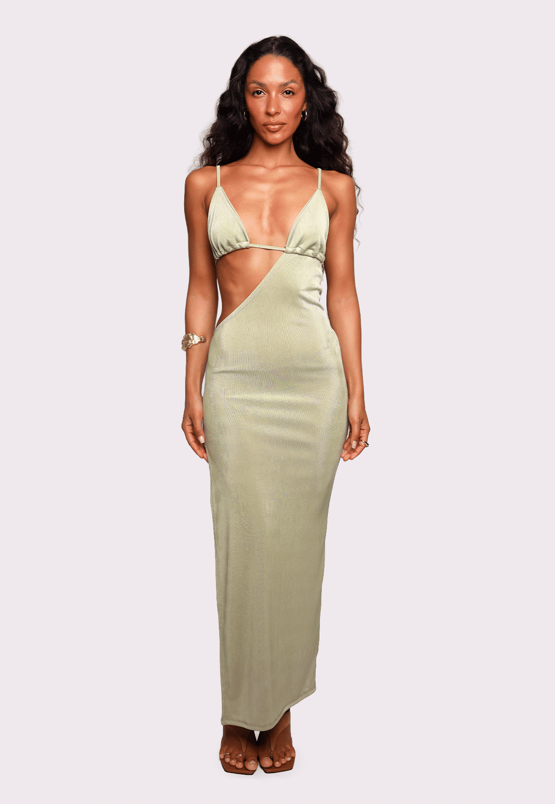 detalhe: vestido feito em malha grossinha super macia e com leve brilho, na cor verde sage. o vestido dá um match perfeito com um jantar pós praia, acompanhado de rasteirinha ou chinelinho, mas também orna super com uma festa/evento noturno. a modelagem do busto é de top cortininha, com regulador dourado nas alças e amarração no centro das costas, possui ponteiras em formato de estrela do mar douradas com banho inoxidável. o comprimento é longo e possui fenda na lateral.